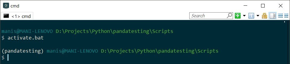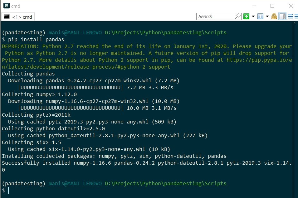 3. Now lets create a folder as a virtual environment, by βpython -m virtualenv <foldername>β, eg: βpython -m virtualenv pandatestingβ